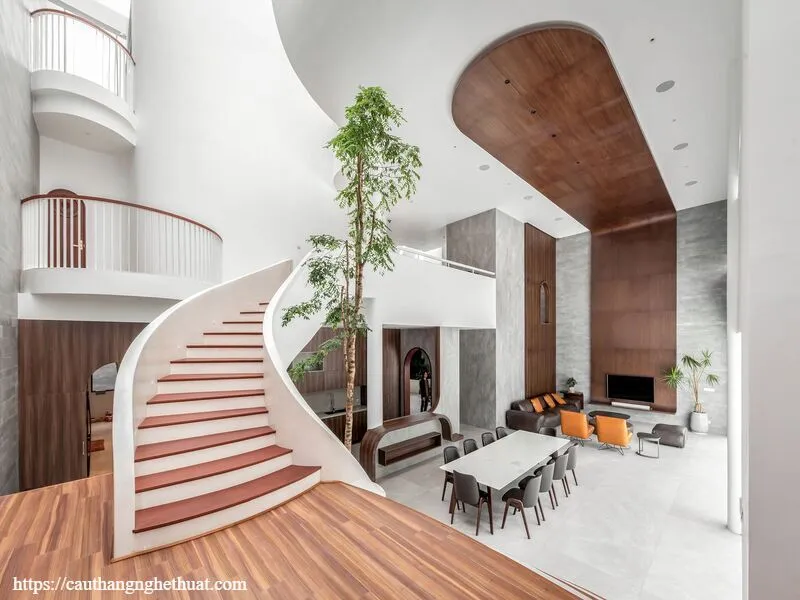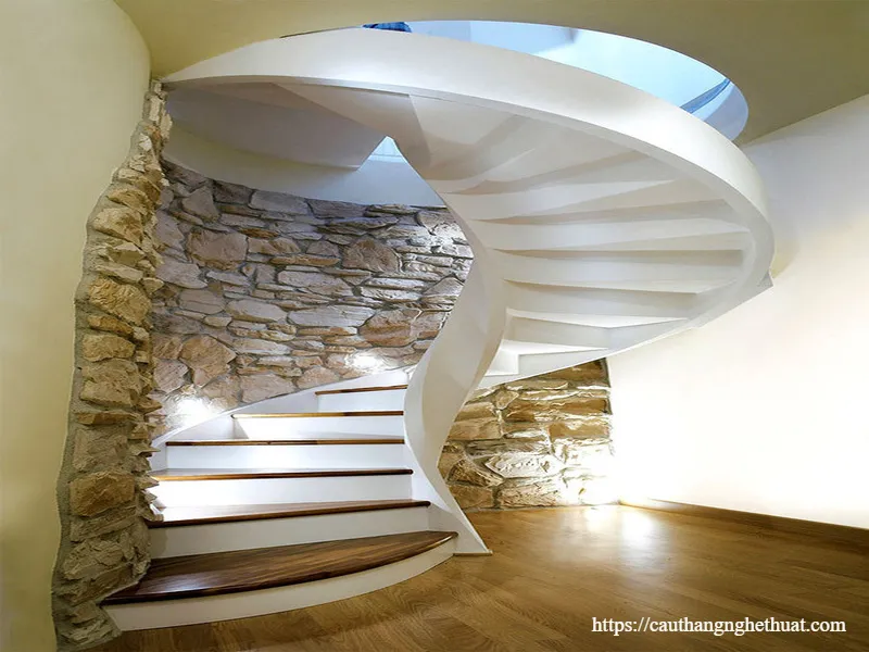 Loại cầu thang này không có trụ trung tâm, thay vào đó là thiết kế uốn cong mềm mại, mang tính nghệ thuật cao. Nó phù hợp với những không gian nhà phố hiện đại, yêu cầu sự sáng tạo trong thiết kế.
